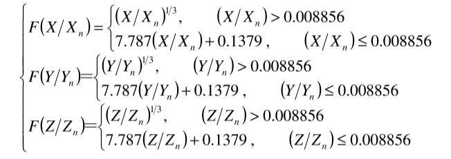 CIELab是CIE1976L*a*b*均匀颜色空间的简称,是由CIEXYZ色度系统经过非线性转换得到的,它用明度指数L*,色品指数a*和b*构成的三维坐标系统来表示颜色感觉,其转换公式如下: