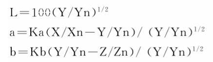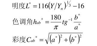 其中:L为明度;a、b为色度;X、Y、Z为物体的三刺激值;Xn、Yn、Zn为完全反射面的三刺激值;Ka、Kb为调整因子。